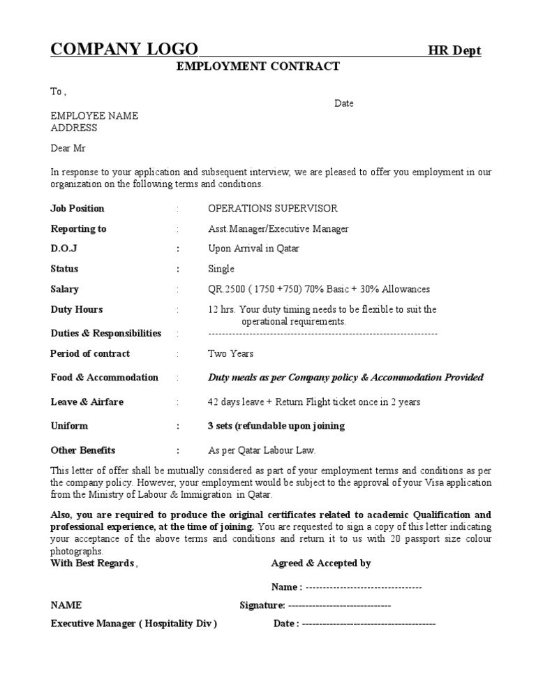 I'm due to leave my job in 6 weeks to start in qatar in 10 weeks should i be concerned? Update teacher scams no 5 as at 20th june. Points needed to be included in a formal offer letter format salary; I am presently in uk. All expats in qatar would now be entirely governed by contracts. I got a job offer from qatar. Job offer letter from qatar company what is legal position. Wow… it is an offer letter for employment. This sample job offer letter is appropriate for most of the positions which you will seek to fill. Using a job offer letter template can help save time to write the letter every time from scratch. A job offer letter is a formal document sent to candidates selected for employment. Why write an offer letter? Is a letter of offer the norm and maybe a contract on arrival?